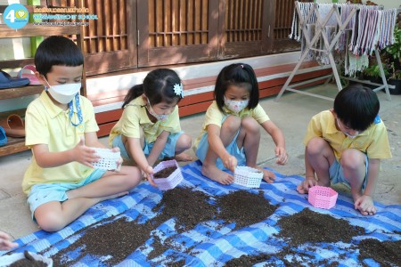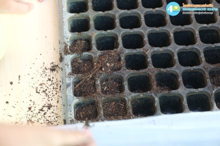 โดยคุณครูแนะนำการเพาะกล้า การหยอดเมล็ด ฟางคลุมดิน และการรดน้ำ