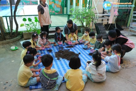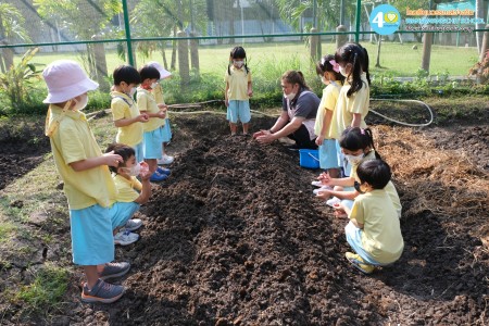 น้องอนุบาล ๒ ร่วมกันปลูกผักสวนครัวที่แปลงเกษตร
