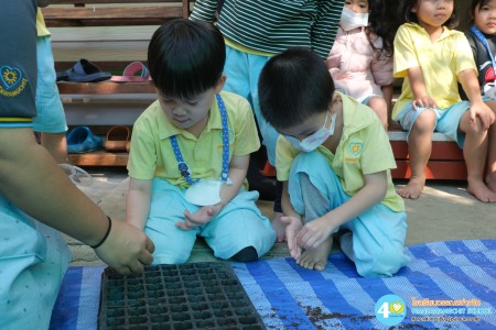 โดยคุณครูแนะนำการเพาะกล้า การหยอดเมล็ด ฟางคลุมดิน และการรดน้ำ