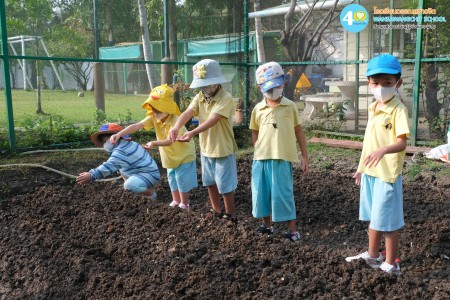 น้องอนุบาล ๒ ร่วมกันปลูกผักสวนครัวที่แปลงเกษตร